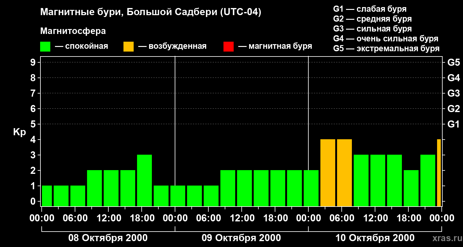 Изменения геомагнитного индекса Kp с 8 по 10 октября 2000 года для средних широт