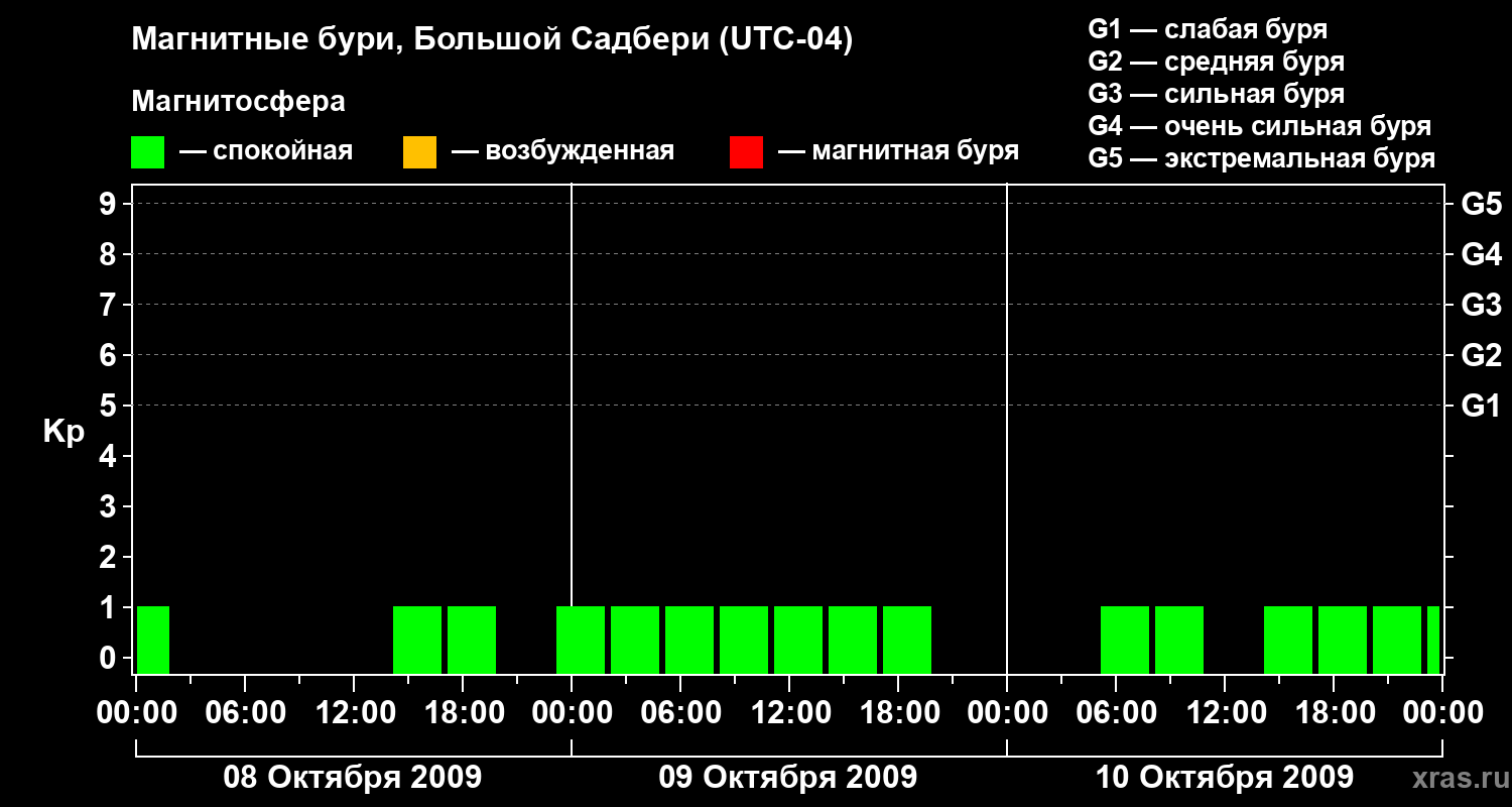 Изменения геомагнитного индекса Kp с 8 по 10 октября 2009 года для средних широт