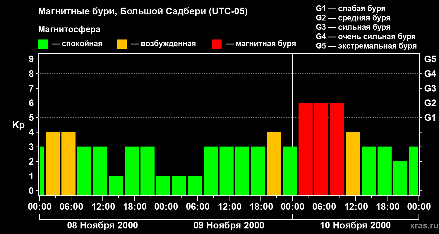 Изменения геомагнитного индекса Kp с 8 по 10 ноября 2000 года для средних широт