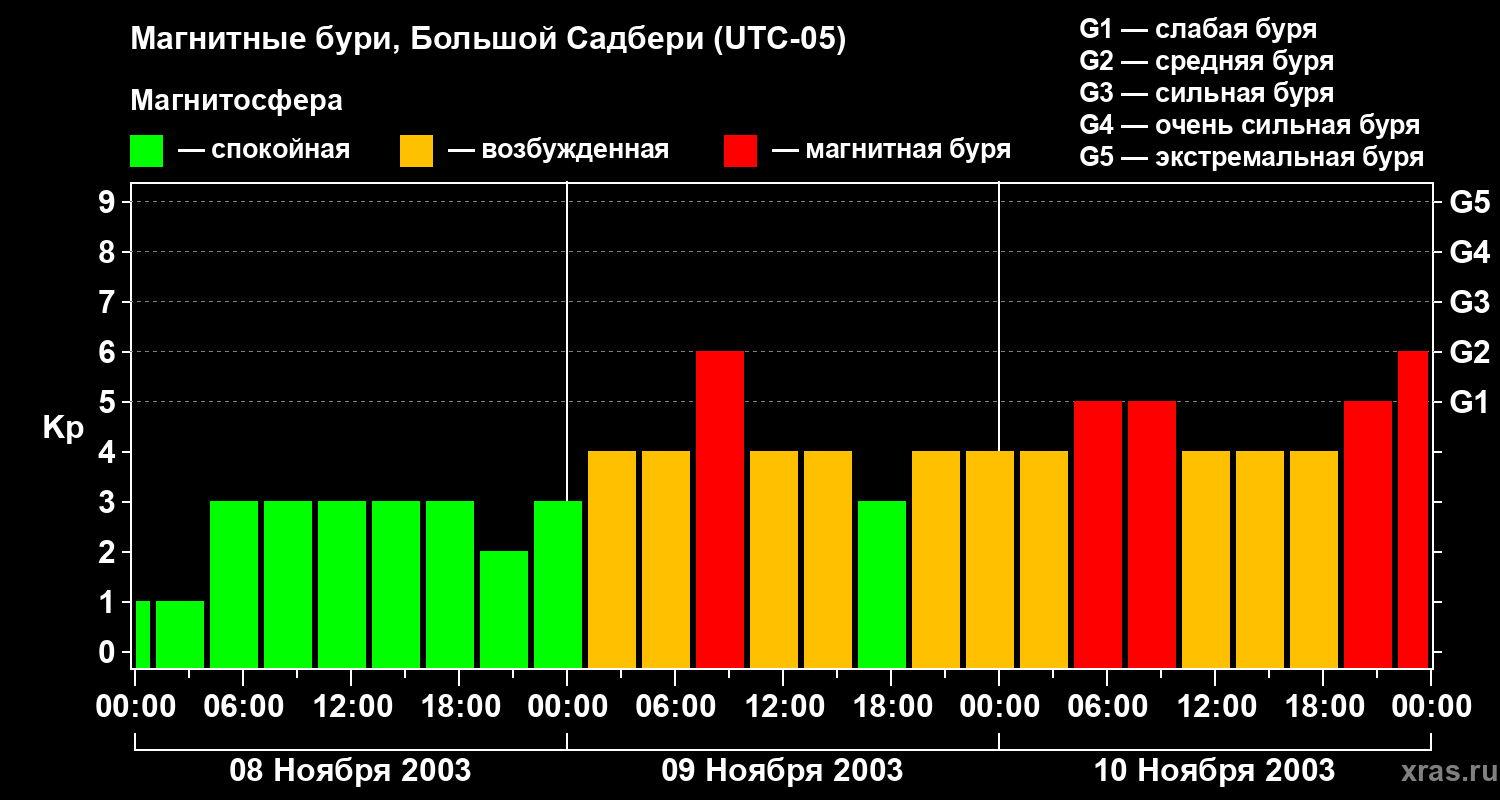 Изменения геомагнитного индекса Kp с 8 по 10 ноября 2003 года для средних широт