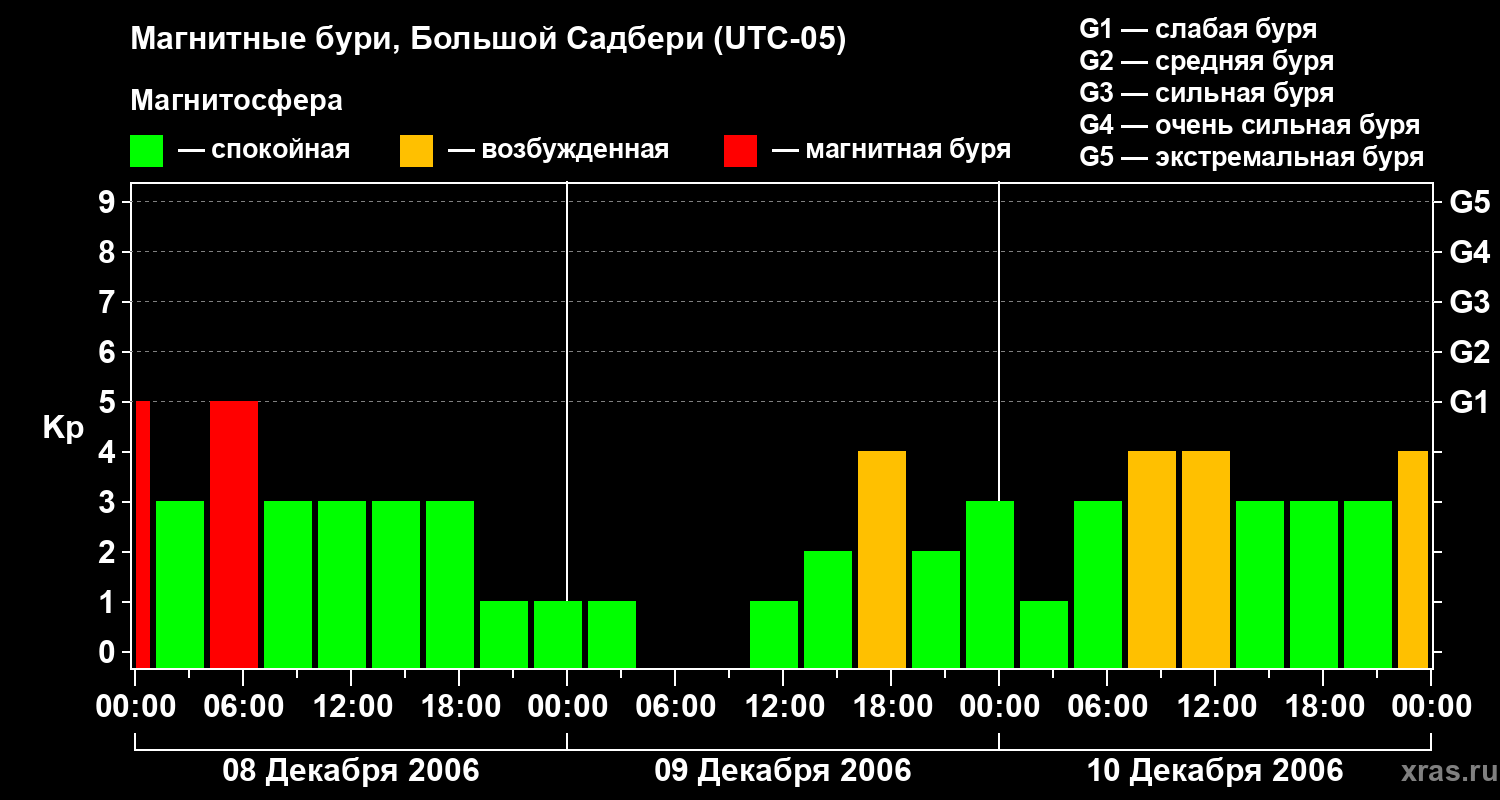 Изменения геомагнитного индекса Kp с 8 по 10 декабря 2006 года для средних широт