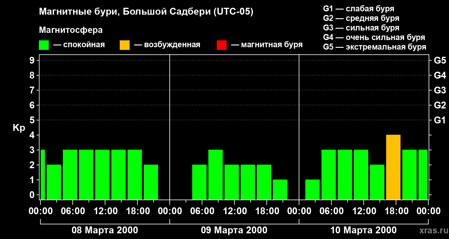 Изменения геомагнитного индекса Kp с 8 по 10 марта 2000 года для средних широт