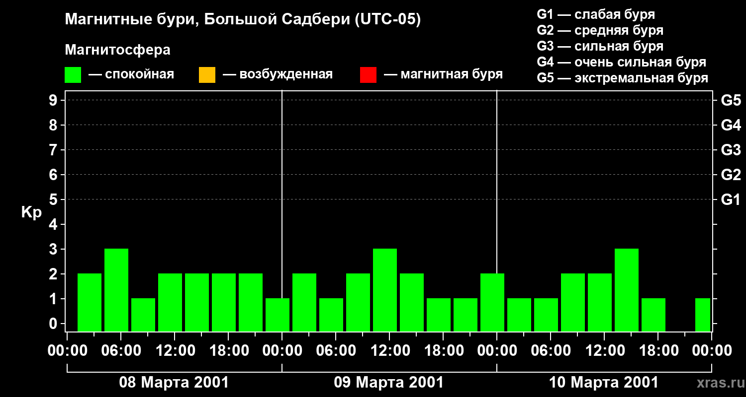 Изменения геомагнитного индекса Kp с 8 по 10 марта 2001 года для средних широт