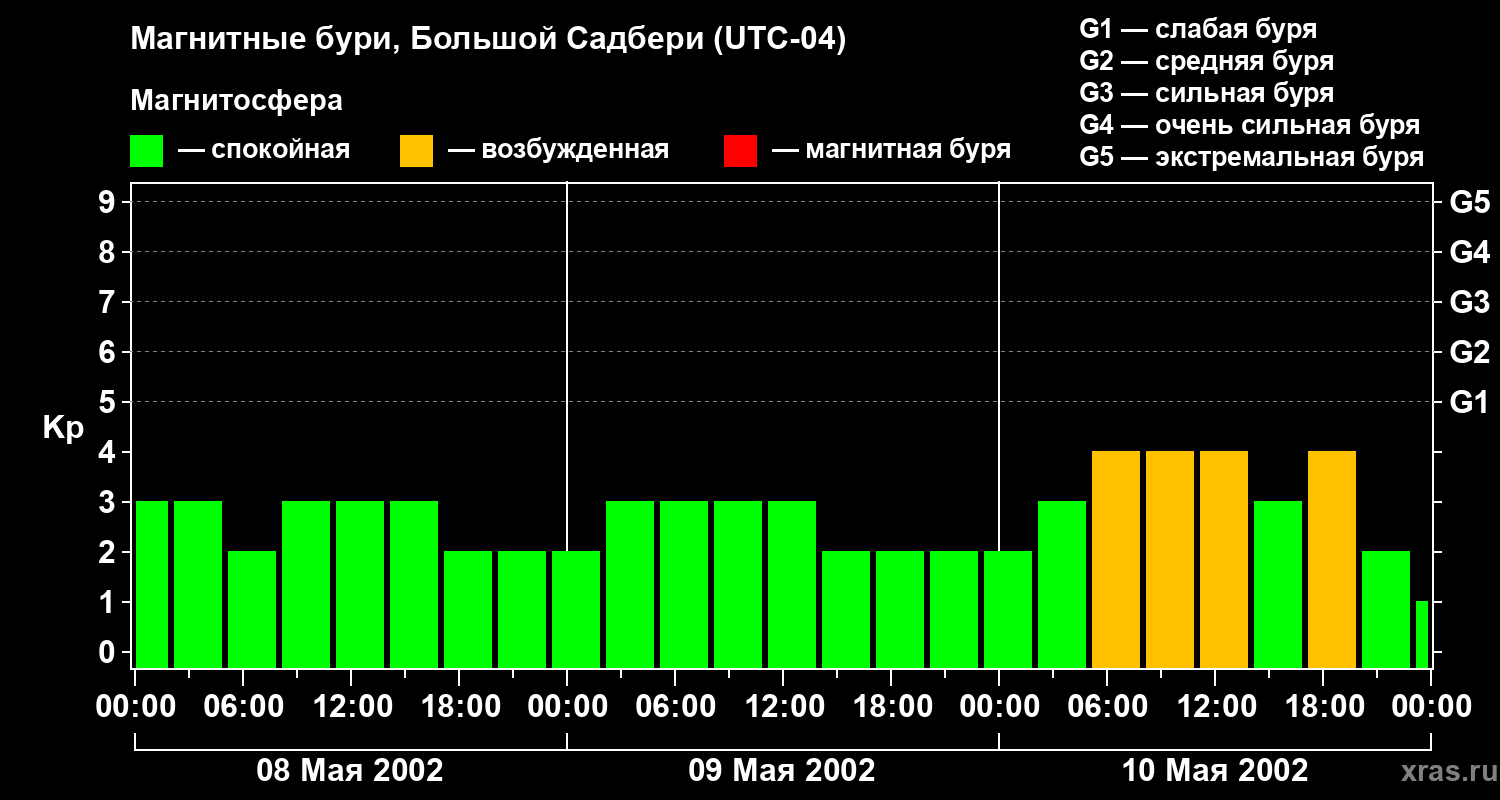 Изменения геомагнитного индекса Kp с 8 по 10 мая 2002 года для средних широт