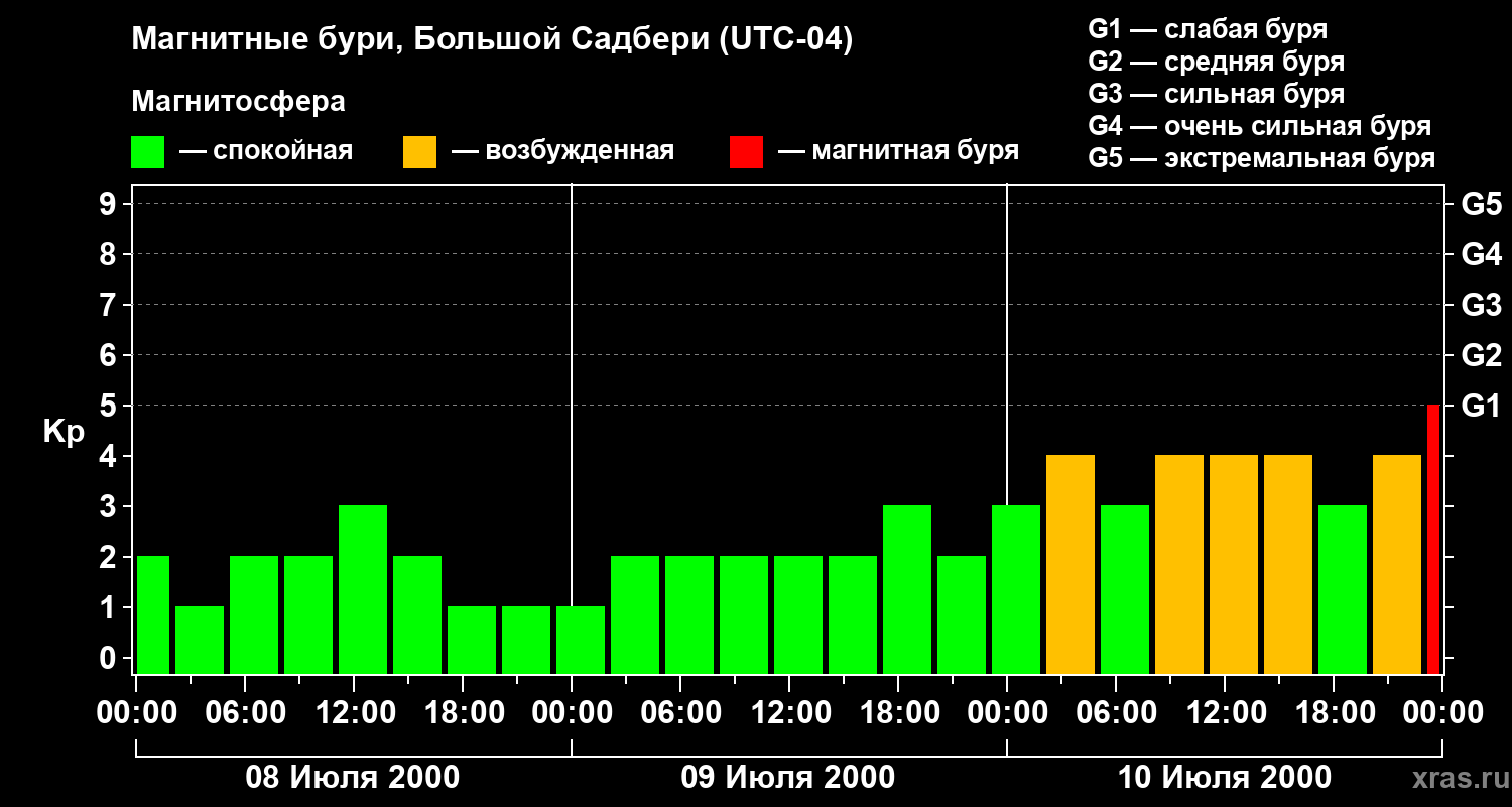 Изменения геомагнитного индекса Kp с 8 по 10 июля 2000 года для средних широт