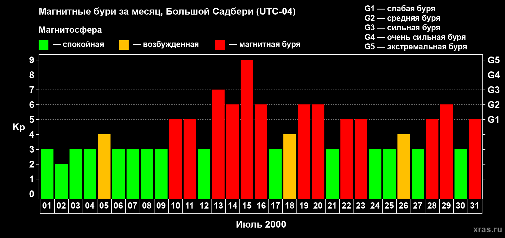 Изменения максимального суточного геомагнитного индекса Kp в июле 2000 года для средних широт