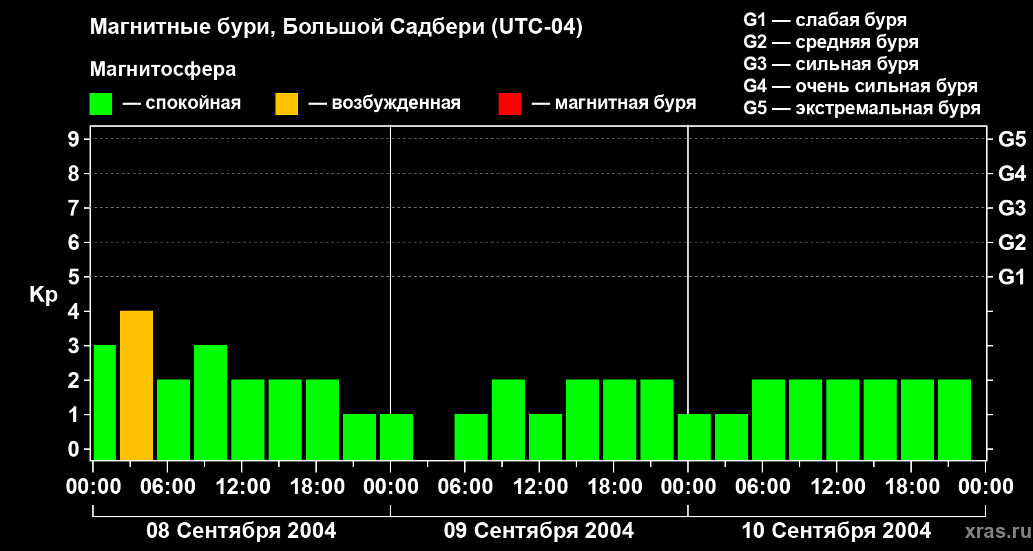Изменения геомагнитного индекса Kp с 8 по 10 сентября 2004 года для средних широт