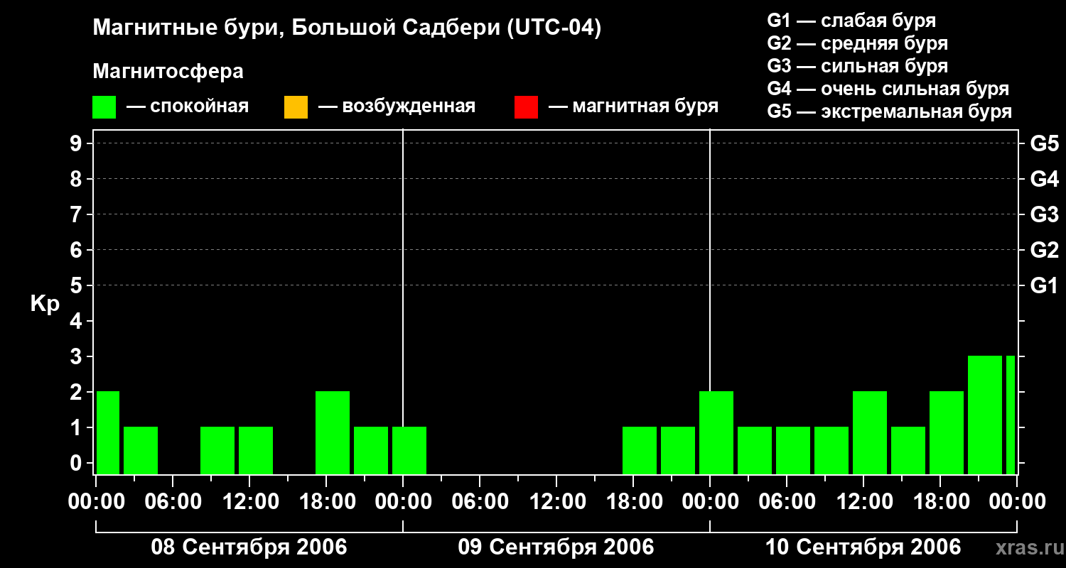 Изменения геомагнитного индекса Kp с 8 по 10 сентября 2006 года для средних широт