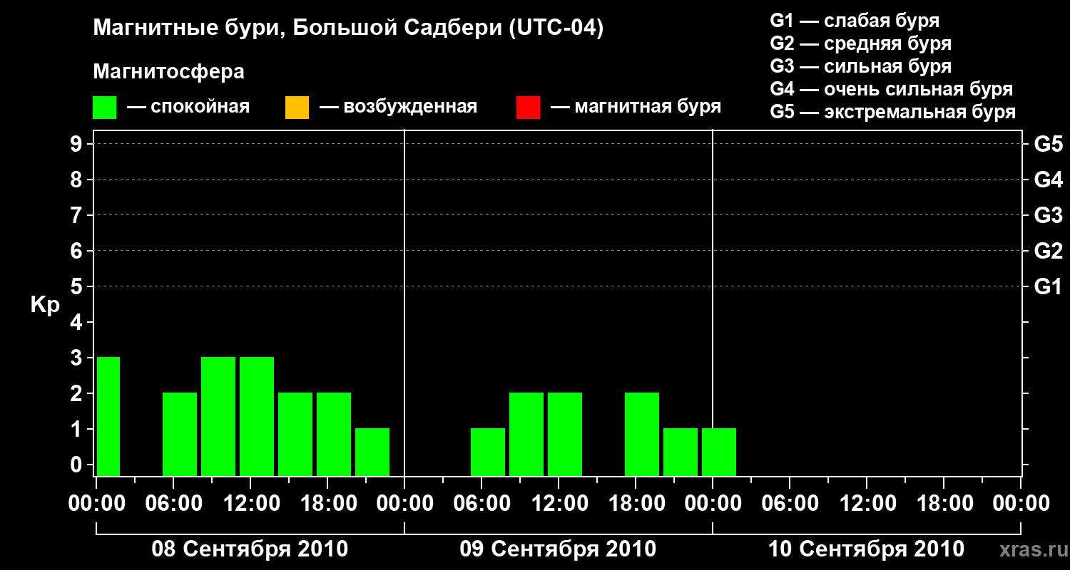 Изменения геомагнитного индекса Kp с 8 по 10 сентября 2010 года для средних широт