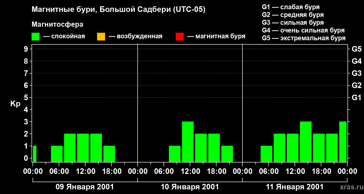 Изменения геомагнитного индекса Kp с 9 по 11 января 2001 года для средних широт