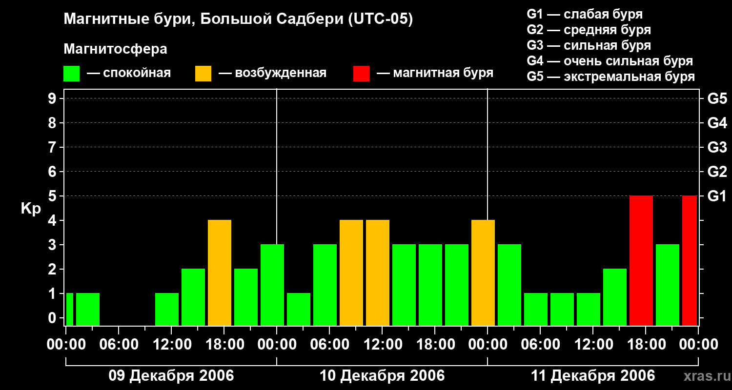Изменения геомагнитного индекса Kp с 9 по 11 декабря 2006 года для средних широт