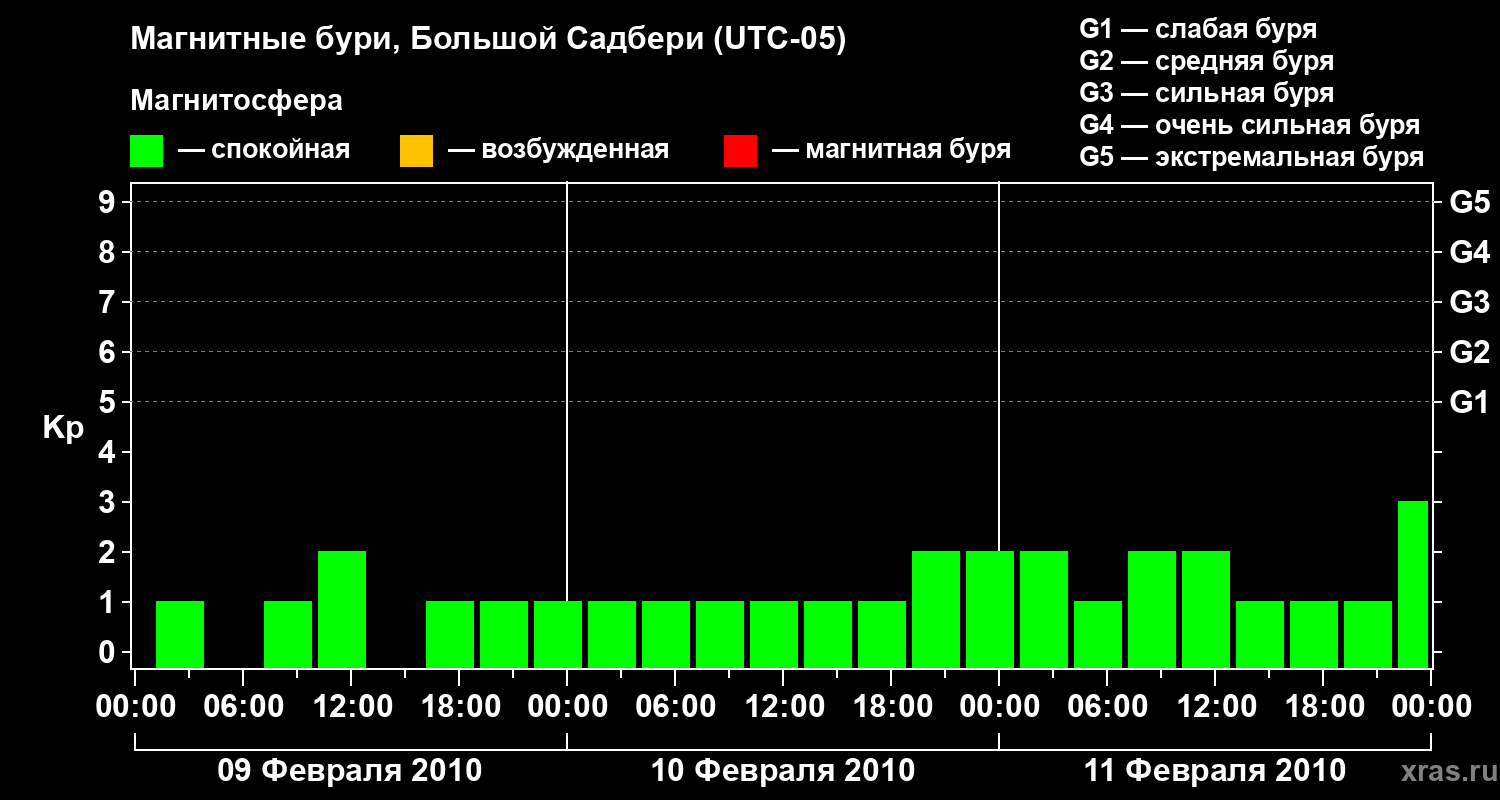 Изменения геомагнитного индекса Kp с 9 по 11 февраля 2010 года для средних широт