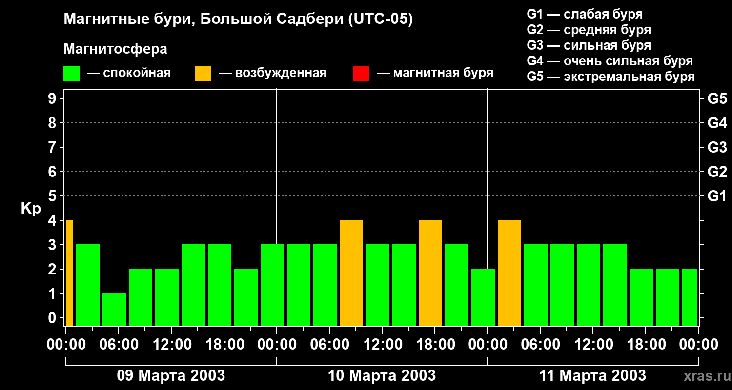 Изменения геомагнитного индекса Kp с 9 по 11 марта 2003 года для средних широт