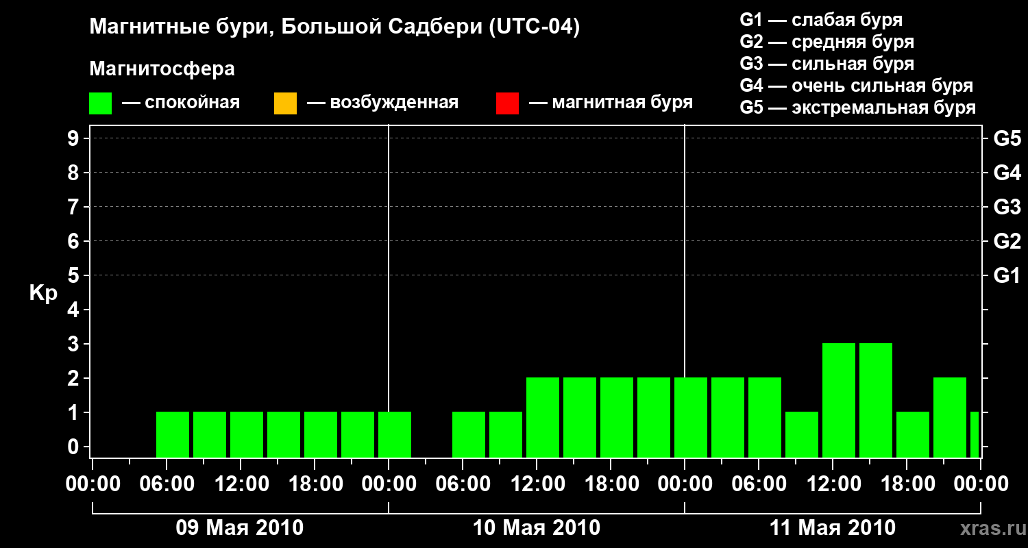 Изменения геомагнитного индекса Kp с 9 по 11 мая 2010 года для средних широт