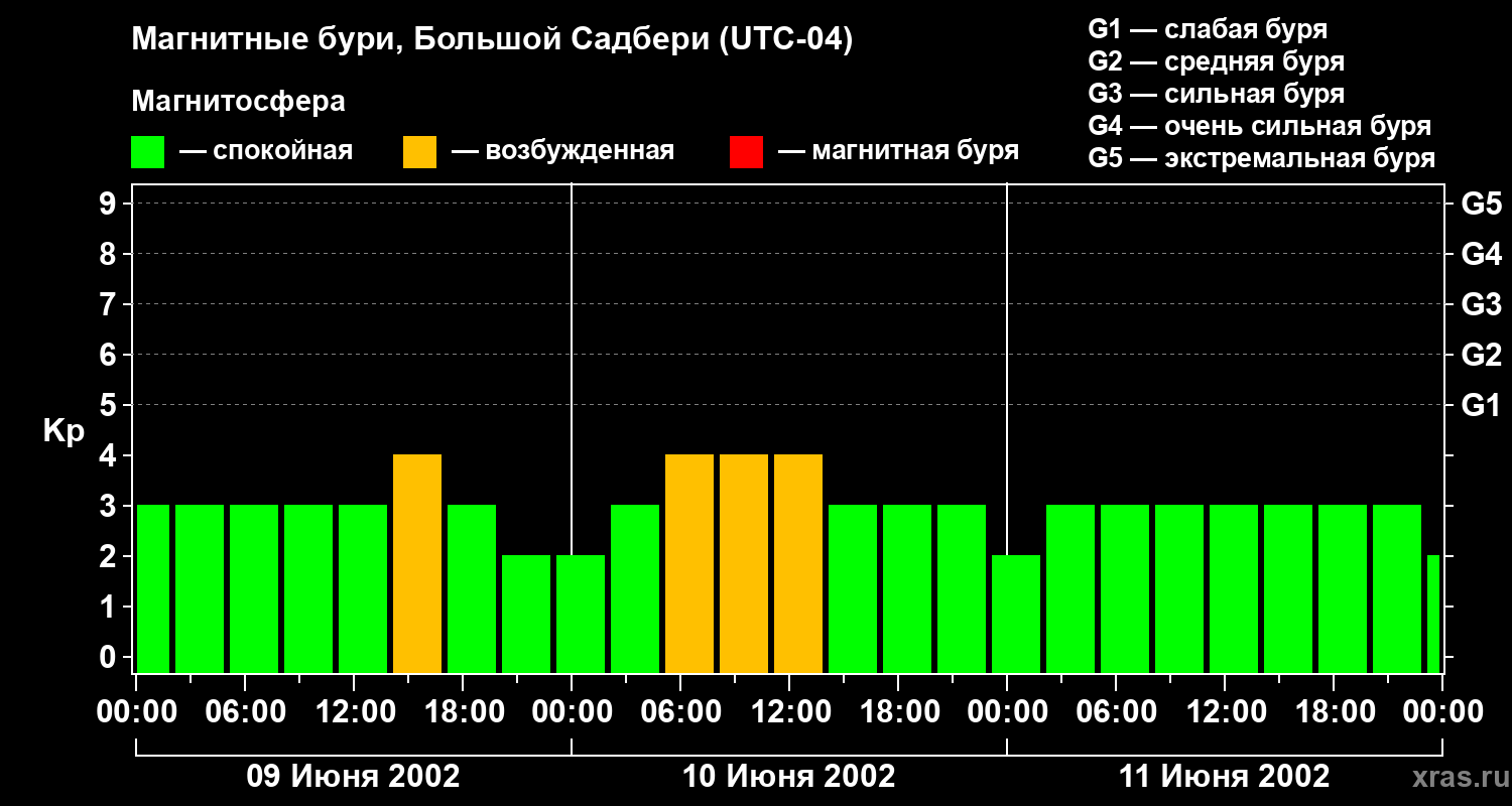 Изменения геомагнитного индекса Kp с 9 по 11 июня 2002 года для средних широт