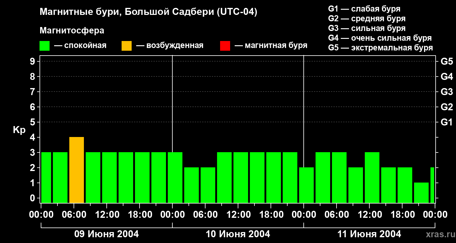 Изменения геомагнитного индекса Kp с 9 по 11 июня 2004 года для средних широт