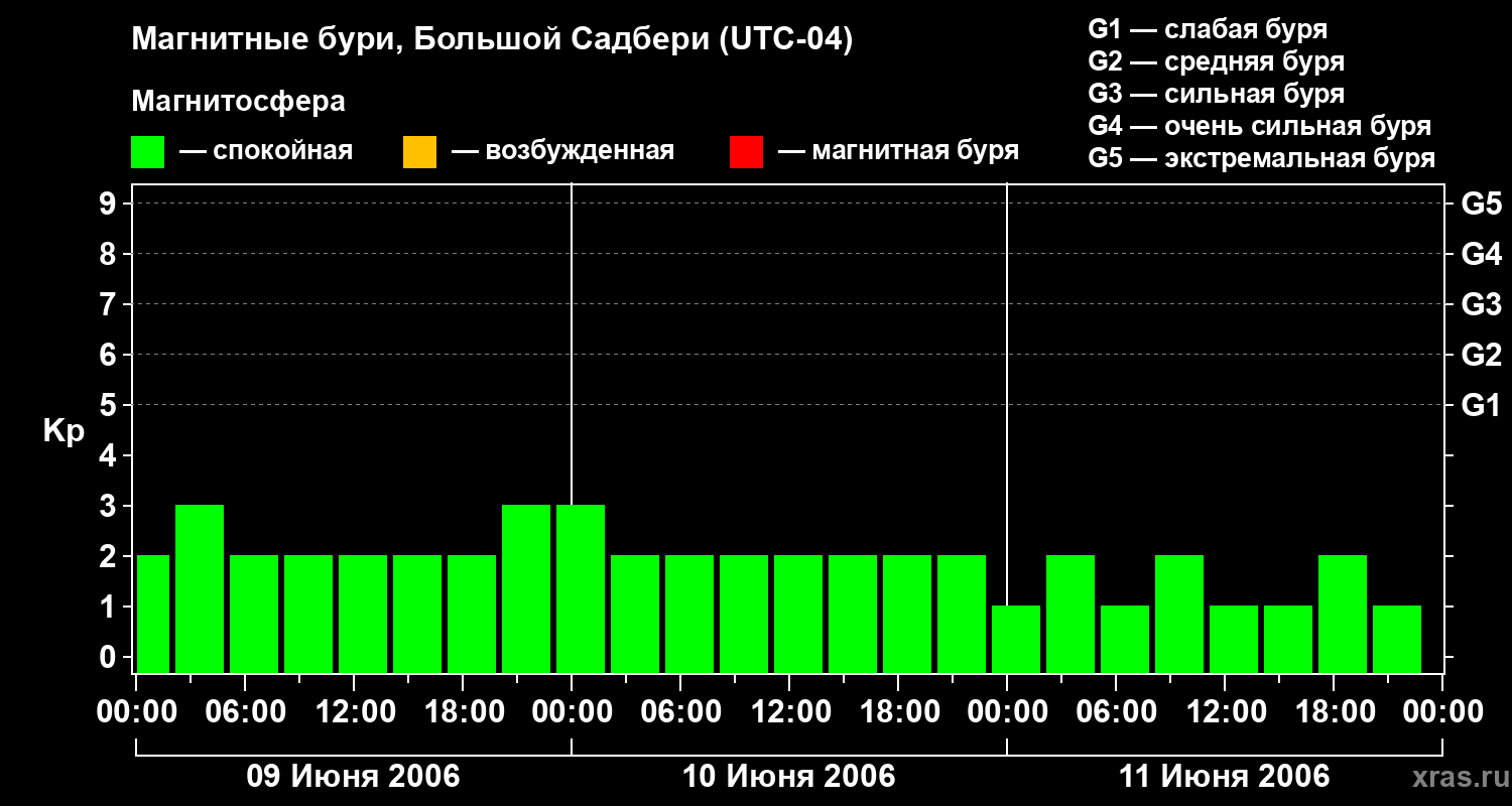 Изменения геомагнитного индекса Kp с 9 по 11 июня 2006 года для средних широт
