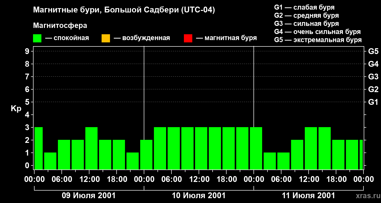 Изменения геомагнитного индекса Kp с 9 по 11 июля 2001 года для средних широт