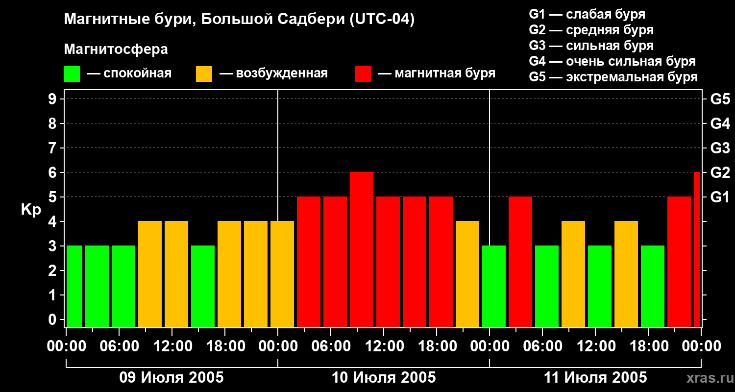 Изменения геомагнитного индекса Kp с 9 по 11 июля 2005 года для средних широт