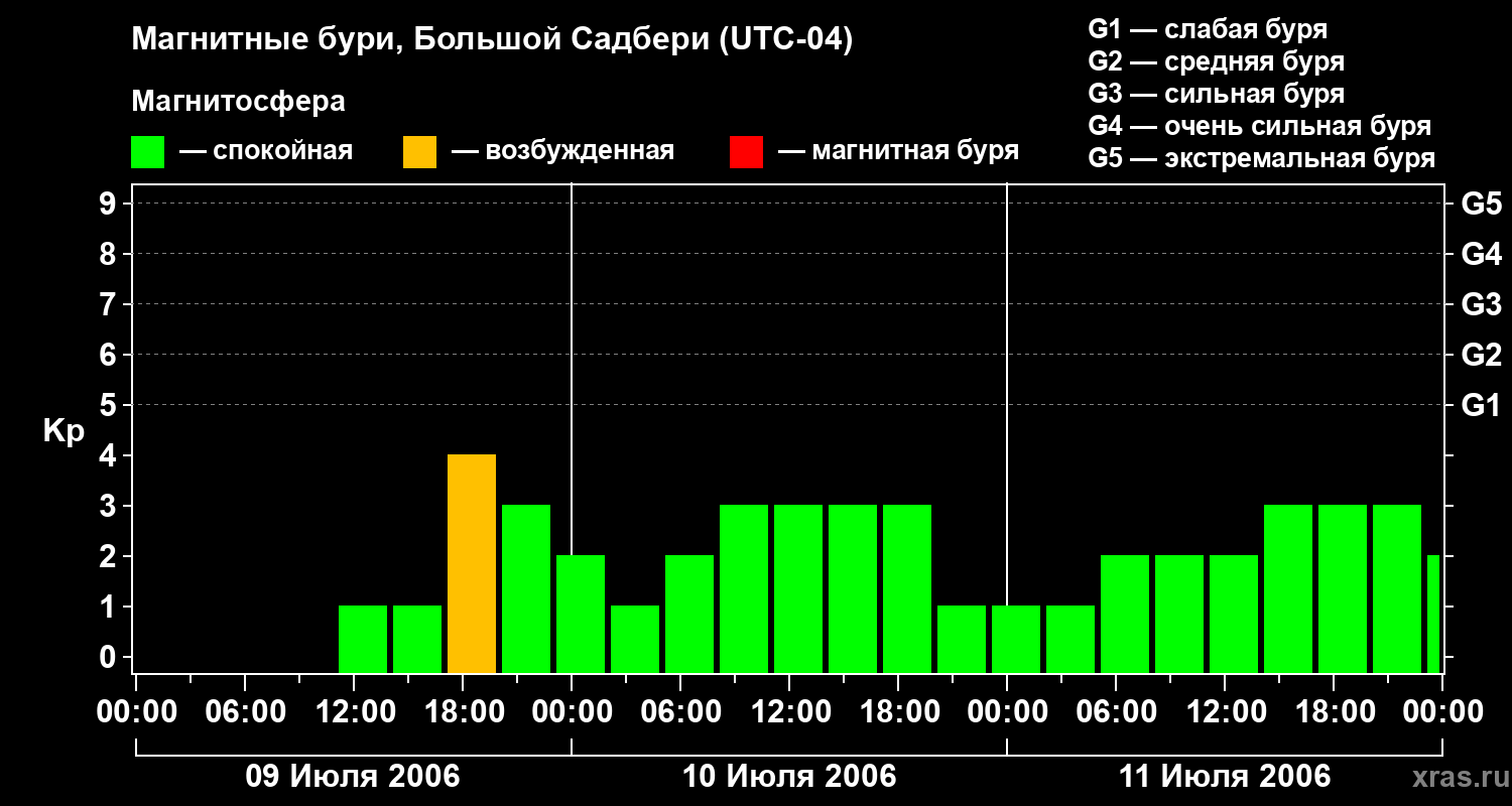 Изменения геомагнитного индекса Kp с 9 по 11 июля 2006 года для средних широт