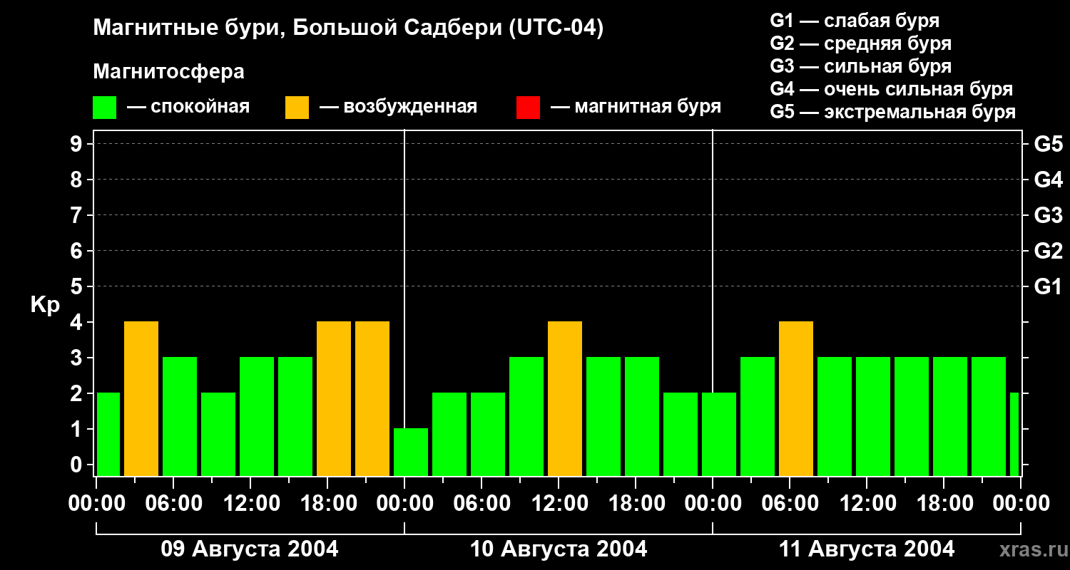 Изменения геомагнитного индекса Kp с 9 по 11 августа 2004 года для средних широт