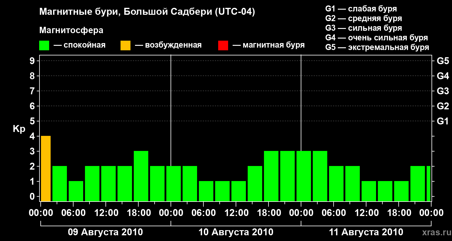 Изменения геомагнитного индекса Kp с 9 по 11 августа 2010 года для средних широт