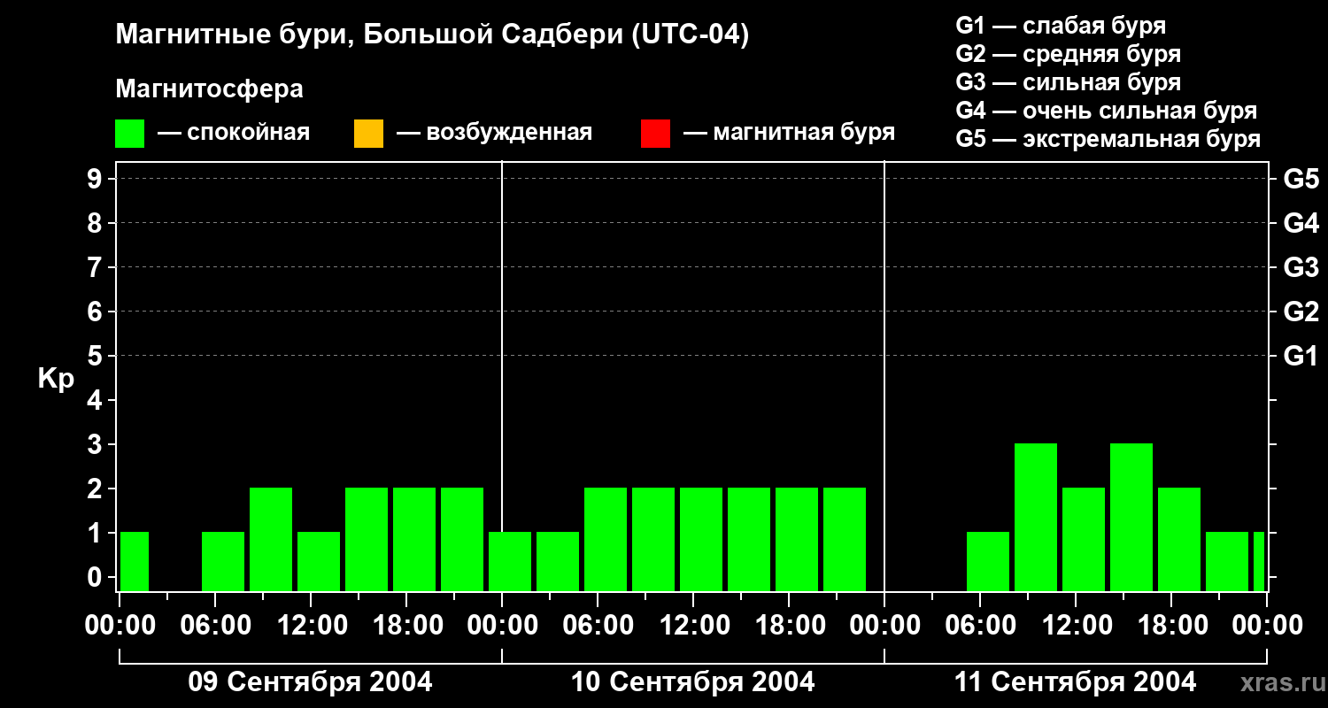 Изменения геомагнитного индекса Kp с 9 по 11 сентября 2004 года для средних широт