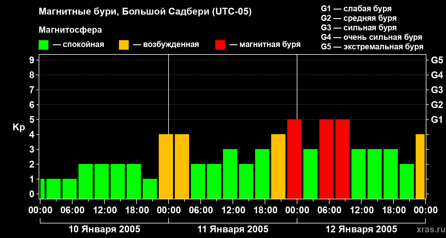 Изменения геомагнитного индекса Kp с 10 по 12 января 2005 года для средних широт