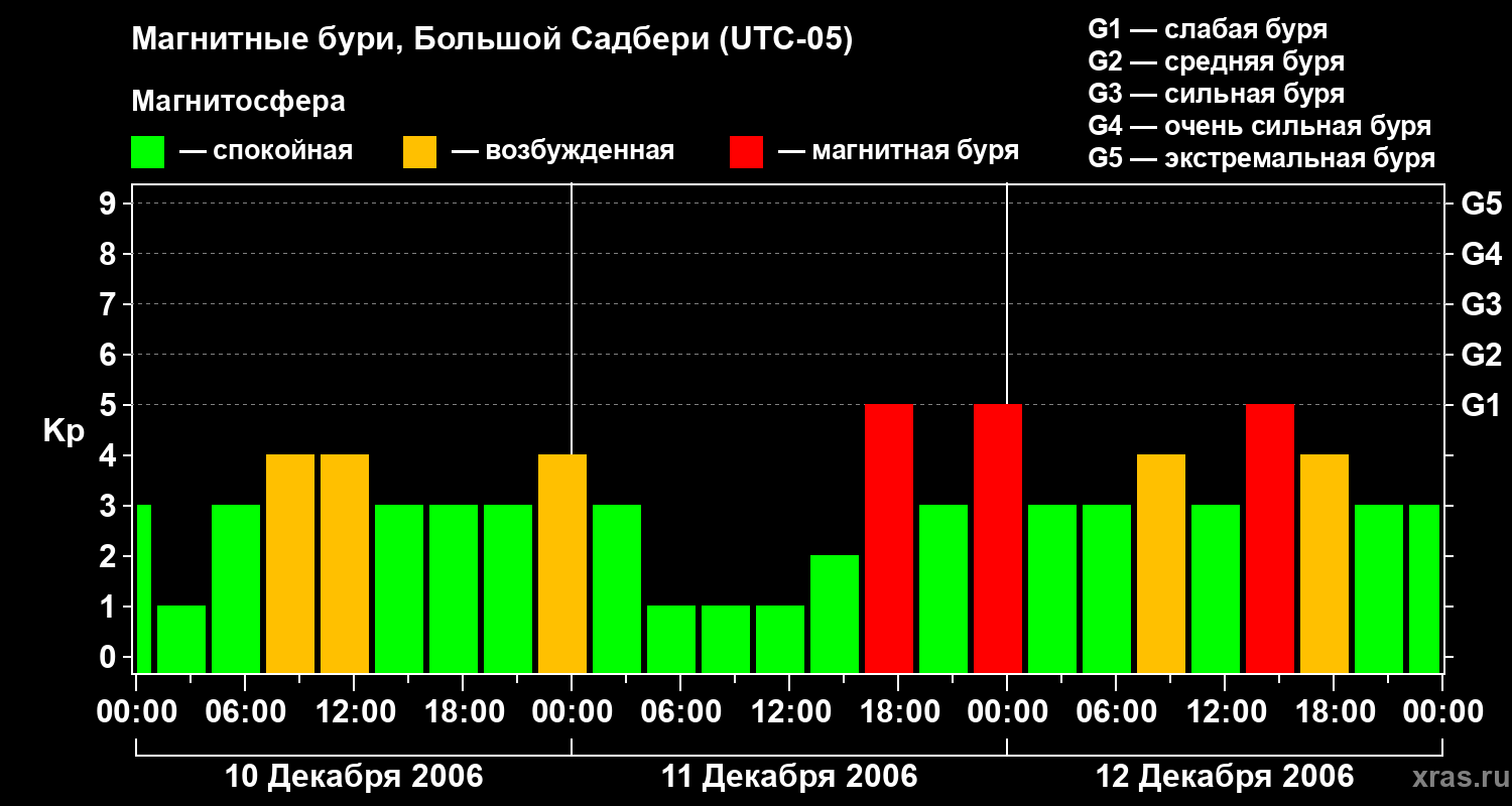 Изменения геомагнитного индекса Kp с 10 по 12 декабря 2006 года для средних широт