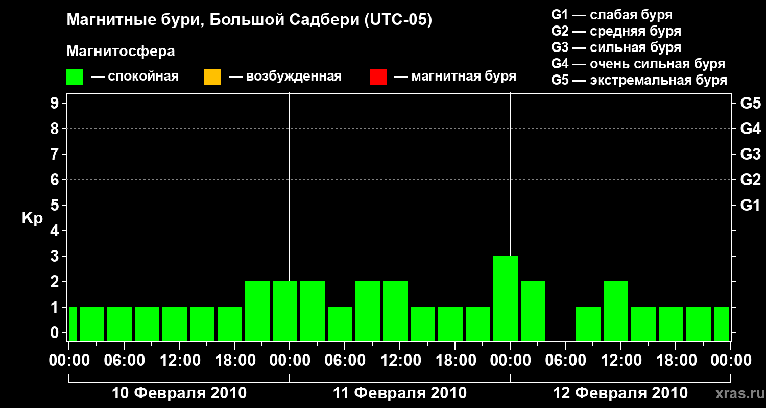 Изменения геомагнитного индекса Kp с 10 по 12 февраля 2010 года для средних широт