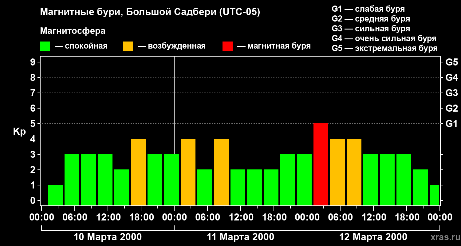 Изменения геомагнитного индекса Kp с 10 по 12 марта 2000 года для средних широт