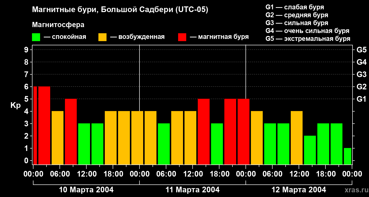 Изменения геомагнитного индекса Kp с 10 по 12 марта 2004 года для средних широт