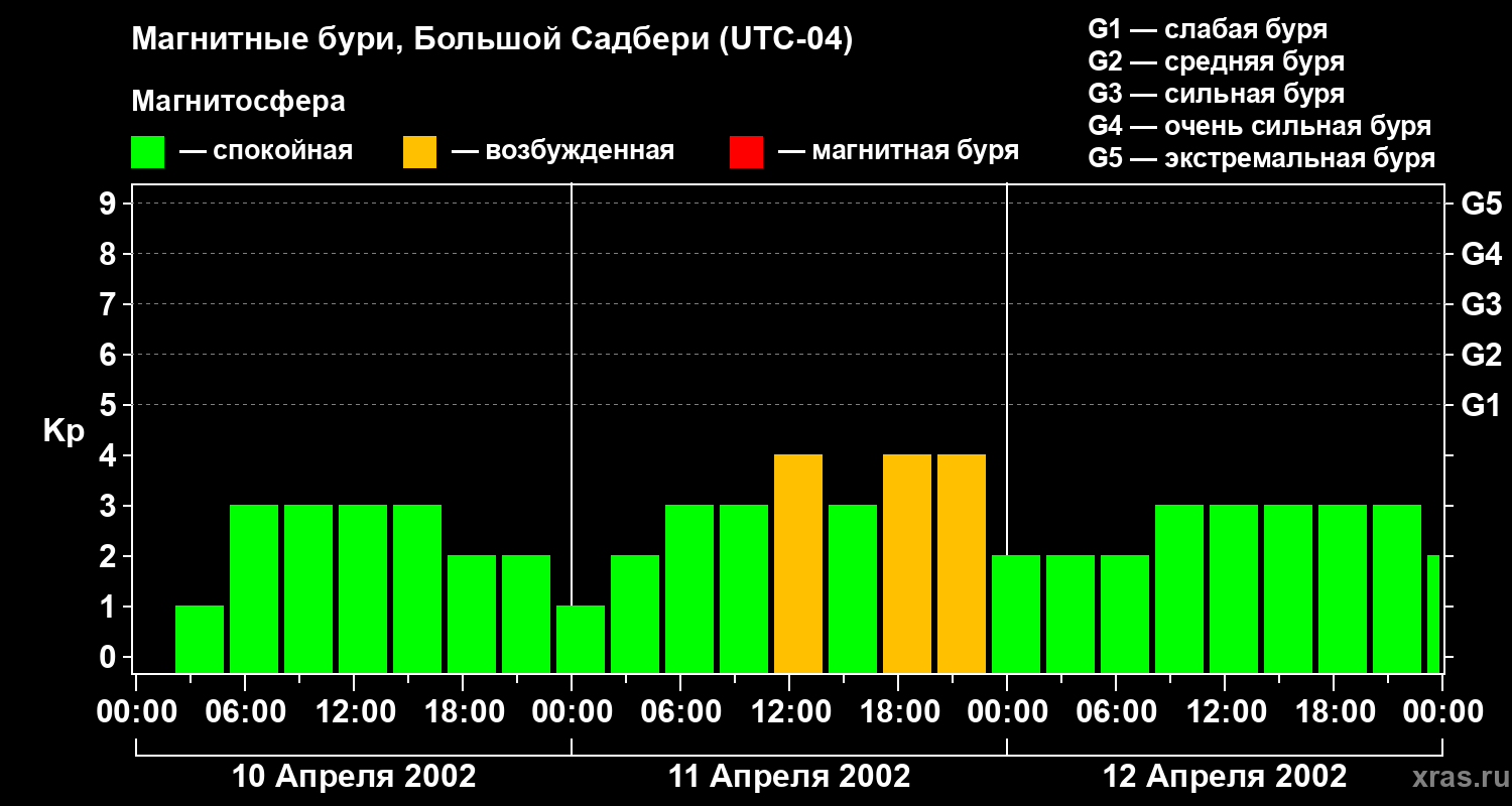 Изменения геомагнитного индекса Kp с 10 по 12 апреля 2002 года для средних широт