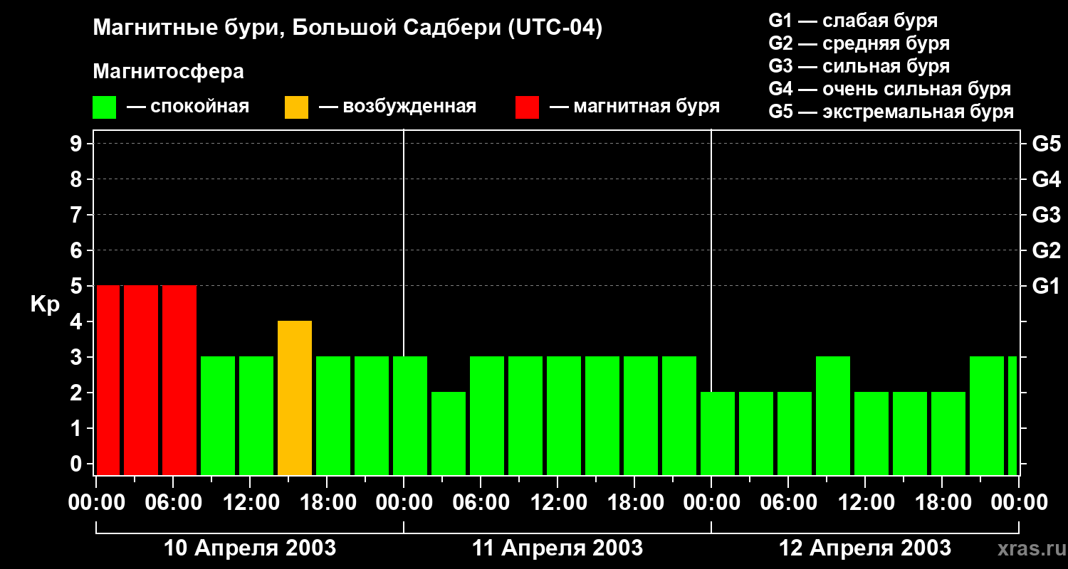 Изменения геомагнитного индекса Kp с 10 по 12 апреля 2003 года для средних широт