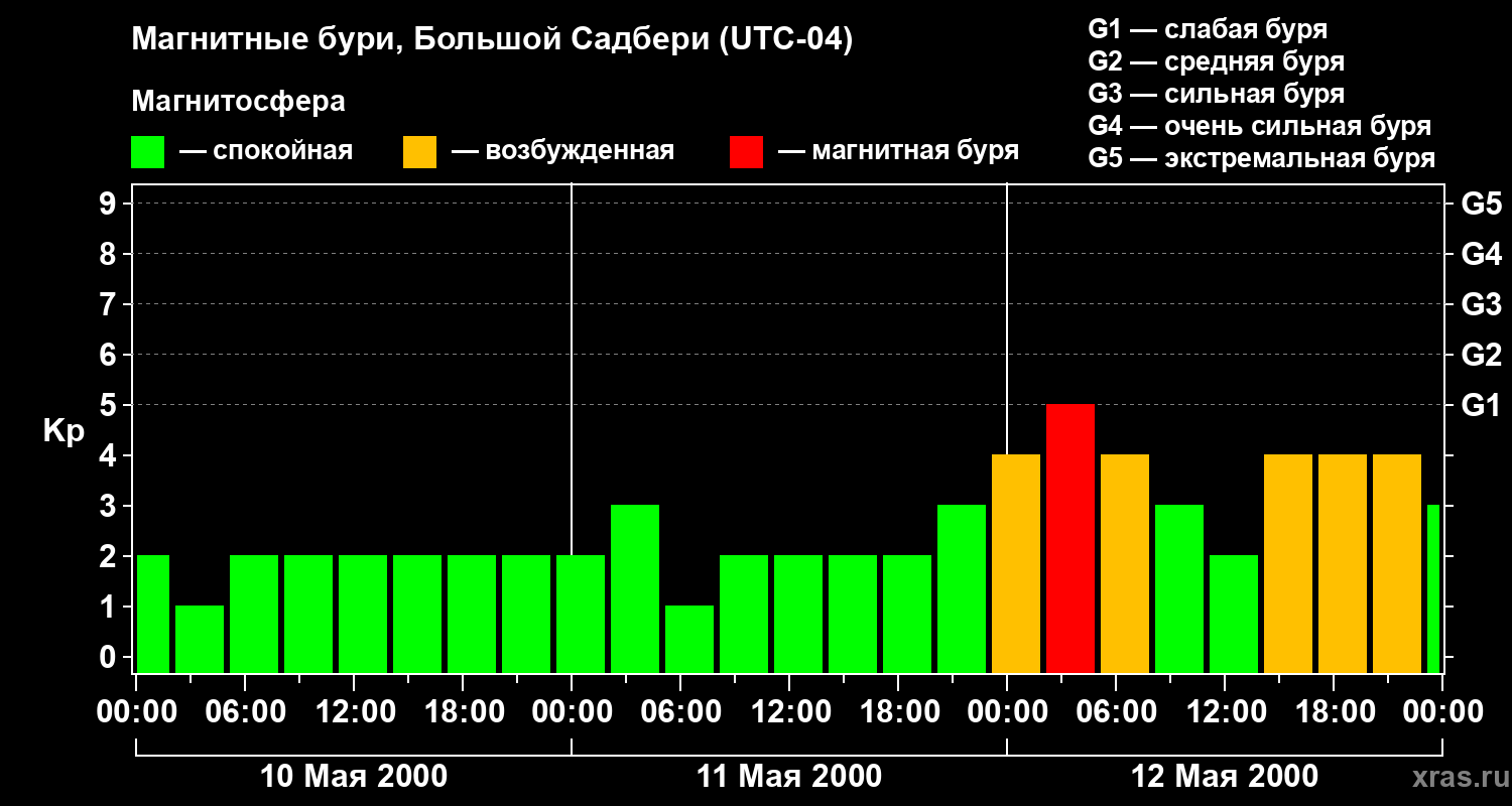 Изменения геомагнитного индекса Kp с 10 по 12 мая 2000 года для средних широт