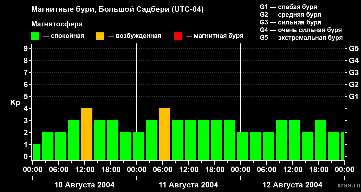 Изменения геомагнитного индекса Kp с 10 по 12 августа 2004 года для средних широт