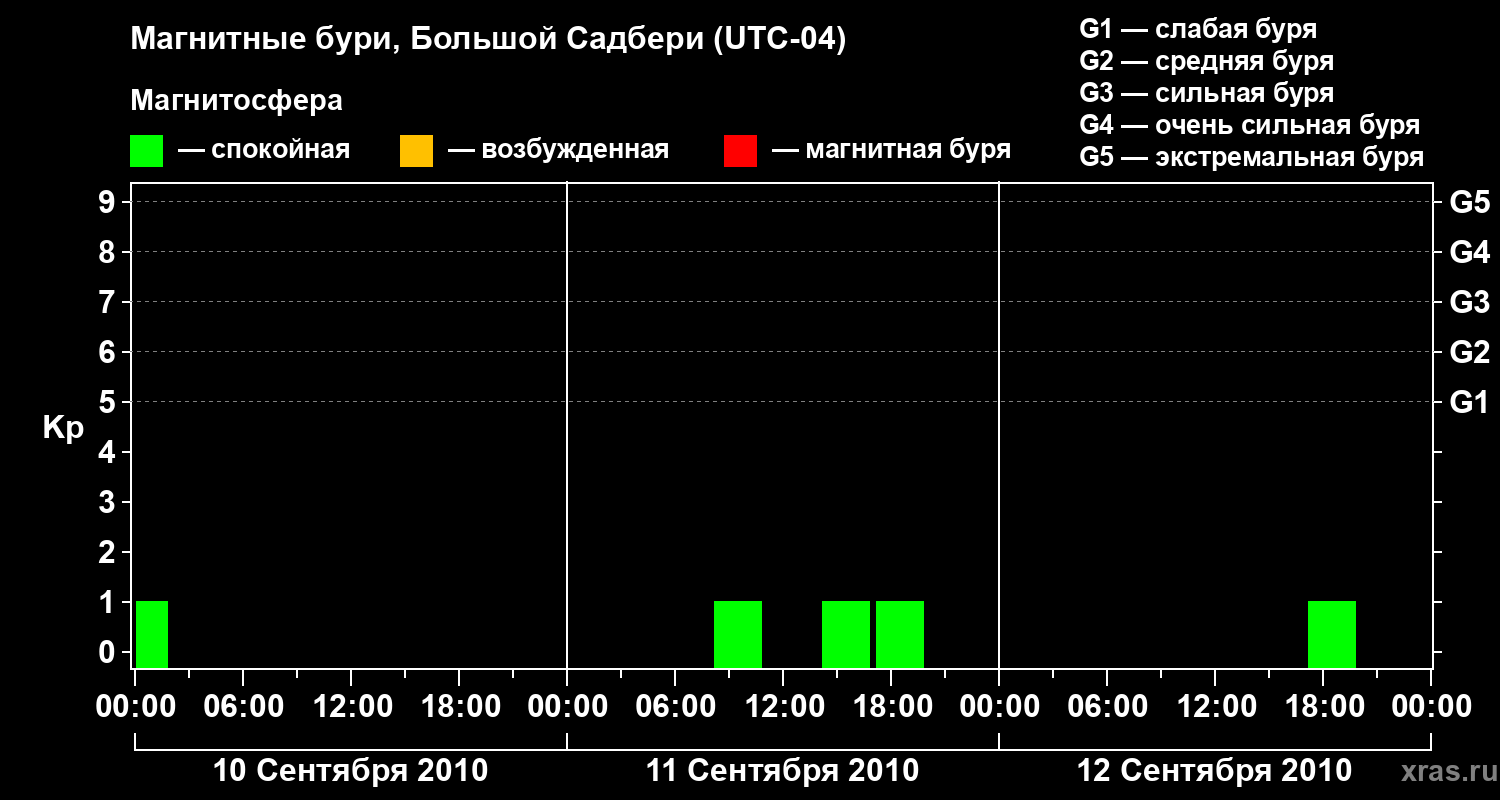 Изменения геомагнитного индекса Kp с 10 по 12 сентября 2010 года для средних широт