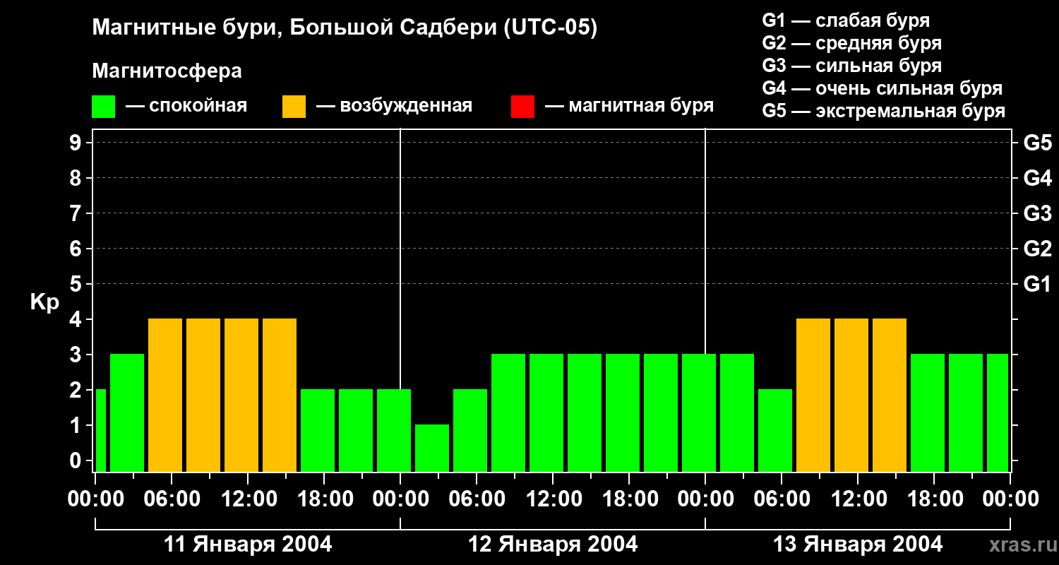 Изменения геомагнитного индекса Kp с 11 по 13 января 2004 года для средних широт
