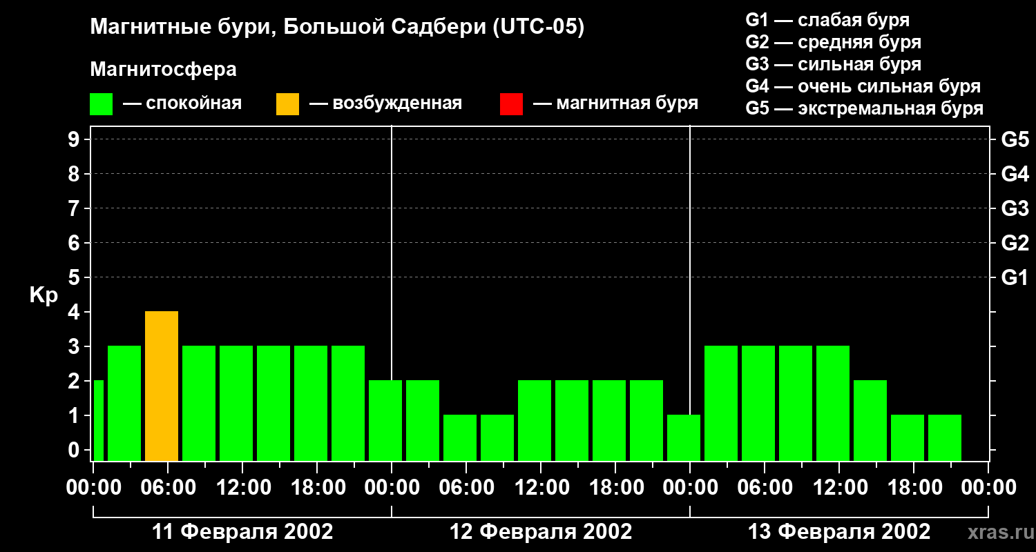 Изменения геомагнитного индекса Kp с 11 по 13 февраля 2002 года для средних широт