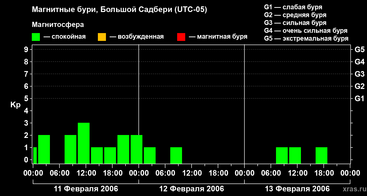 Изменения геомагнитного индекса Kp с 11 по 13 февраля 2006 года для средних широт