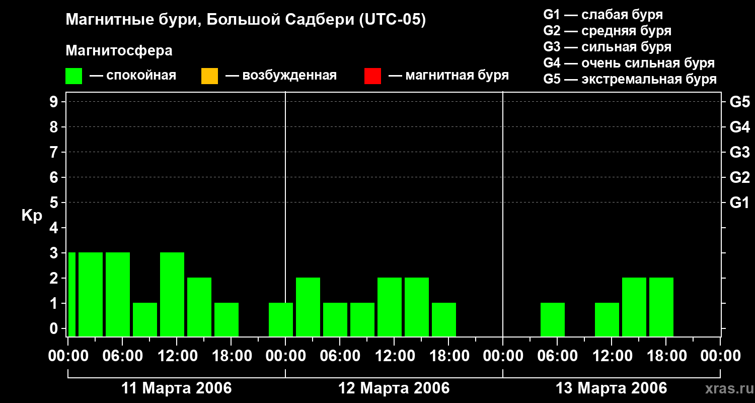 Изменения геомагнитного индекса Kp с 11 по 13 марта 2006 года для средних широт