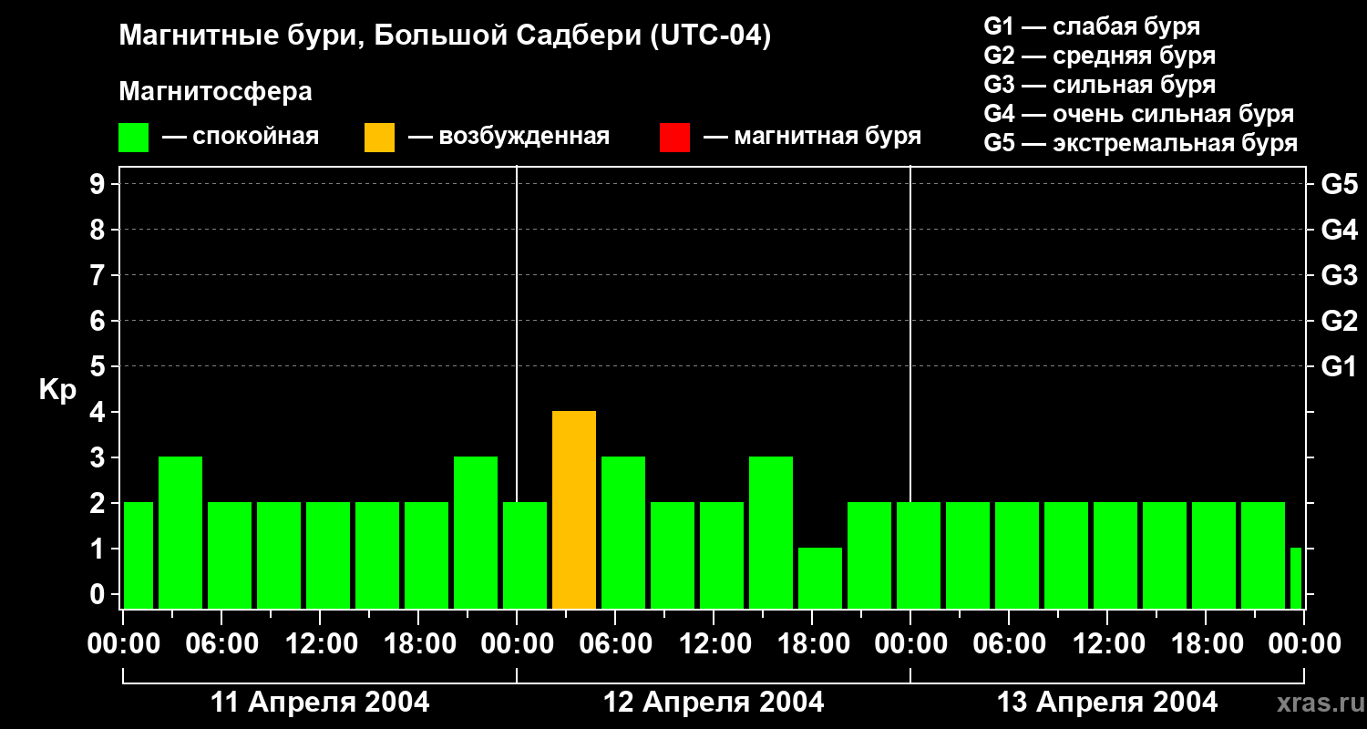 Изменения геомагнитного индекса Kp с 11 по 13 апреля 2004 года для средних широт