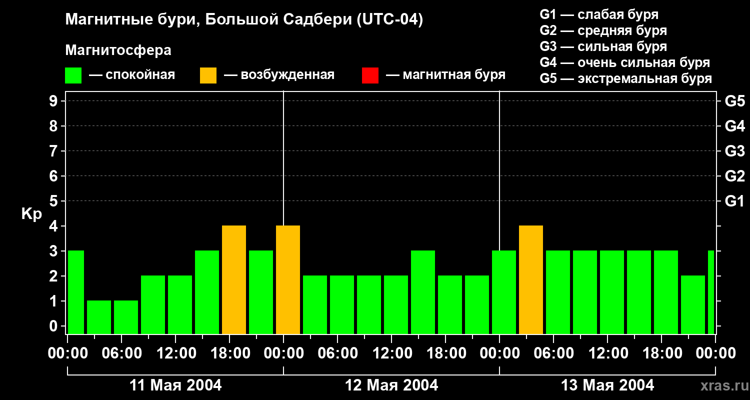 Изменения геомагнитного индекса Kp с 11 по 13 мая 2004 года для средних широт