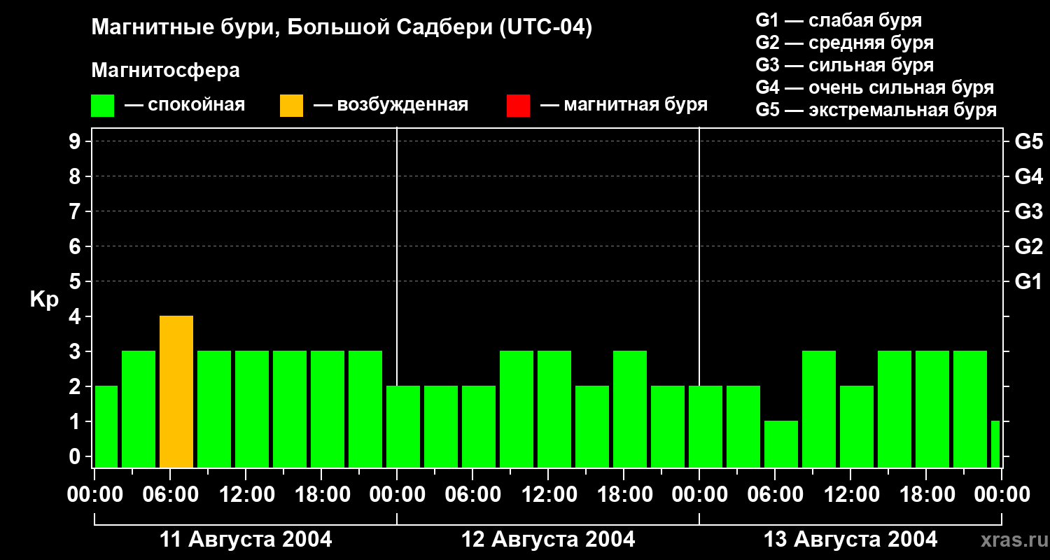 Изменения геомагнитного индекса Kp с 11 по 13 августа 2004 года для средних широт