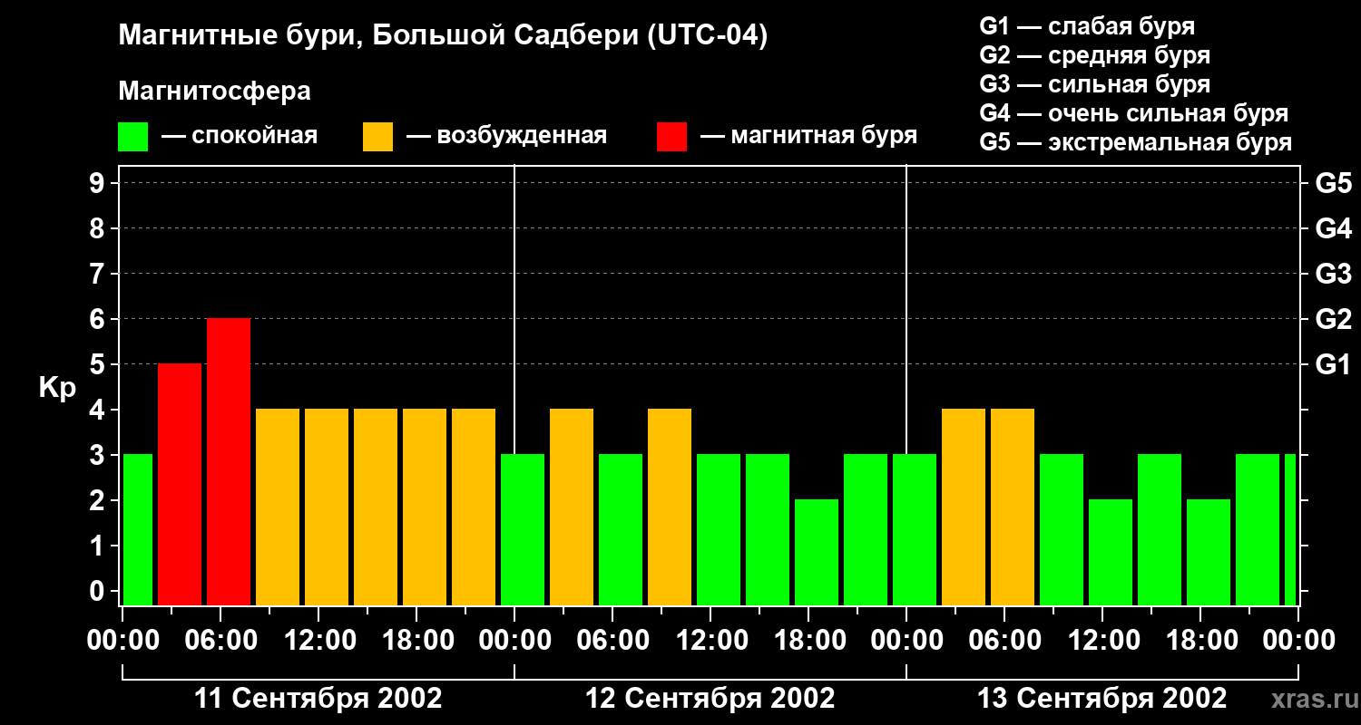 Изменения геомагнитного индекса Kp с 11 по 13 сентября 2002 года для средних широт