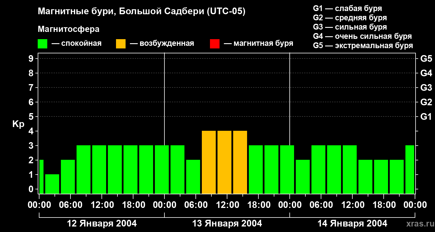 Изменения геомагнитного индекса Kp с 12 по 14 января 2004 года для средних широт