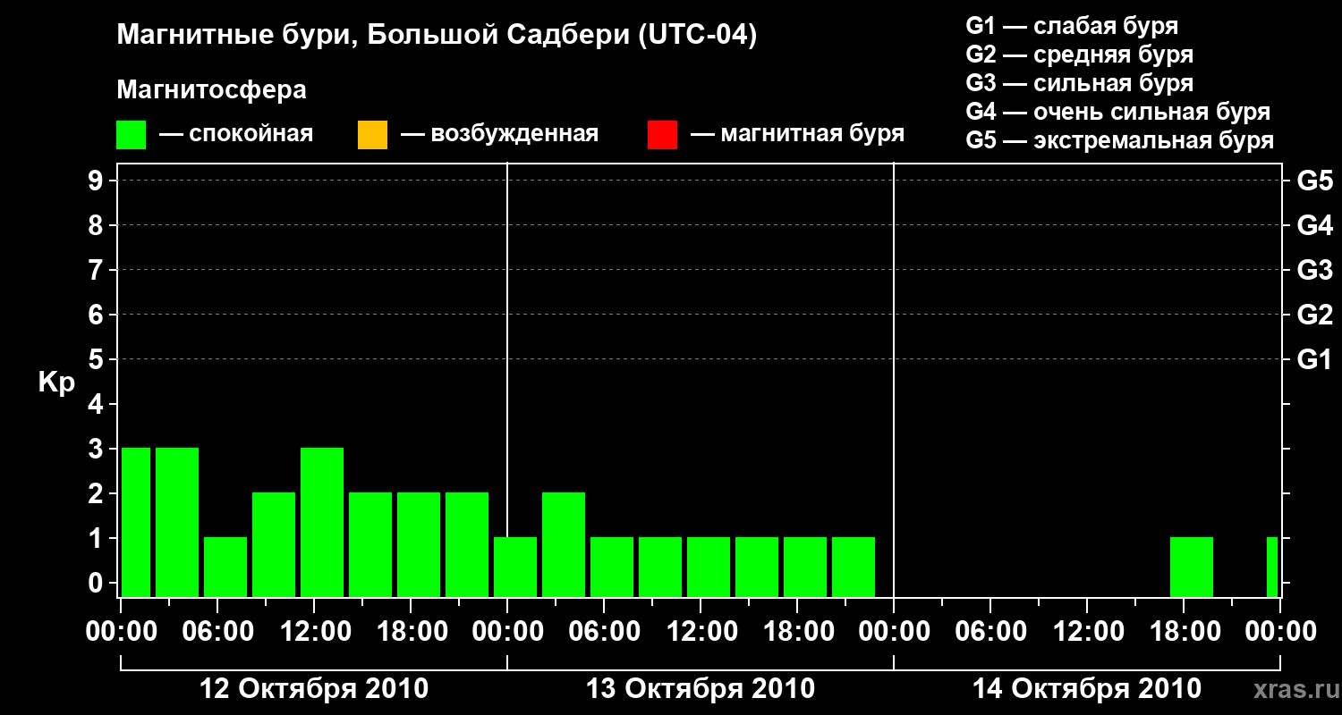 Изменения геомагнитного индекса Kp с 12 по 14 октября 2010 года для средних широт
