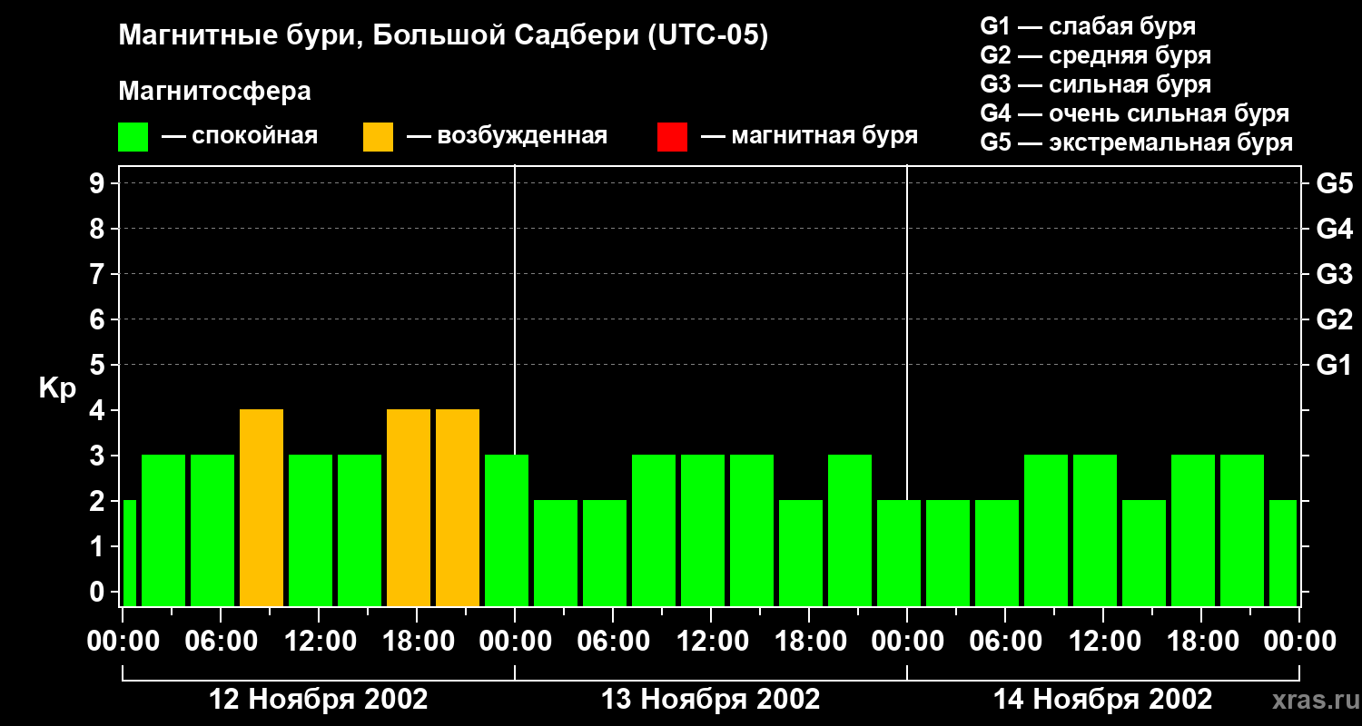 Изменения геомагнитного индекса Kp с 12 по 14 ноября 2002 года для средних широт
