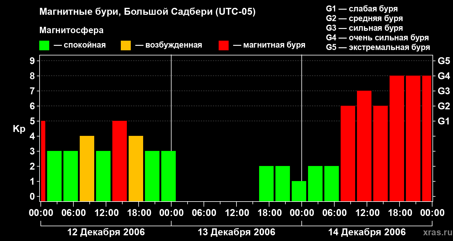 Изменения геомагнитного индекса Kp с 12 по 14 декабря 2006 года для средних широт