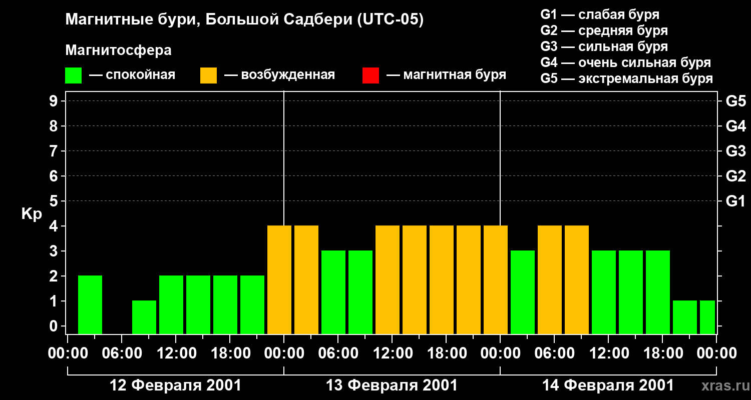 Изменения геомагнитного индекса Kp с 12 по 14 февраля 2001 года для средних широт